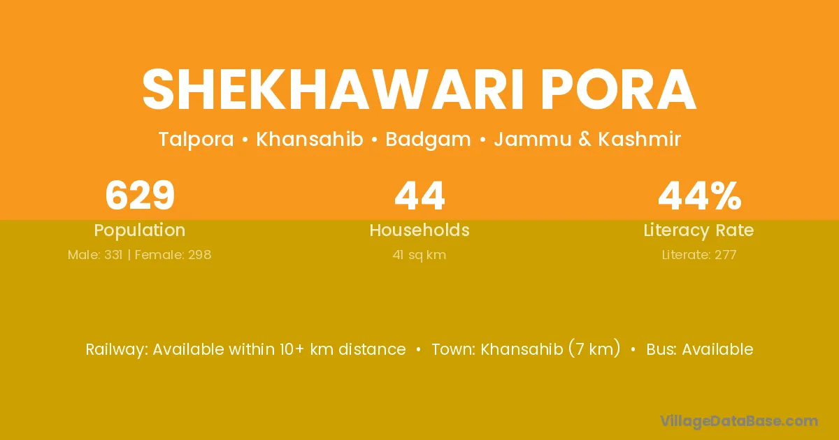 Shekhawari Pora village has a total population of 629 people, of which 331 are males and 298 are females.