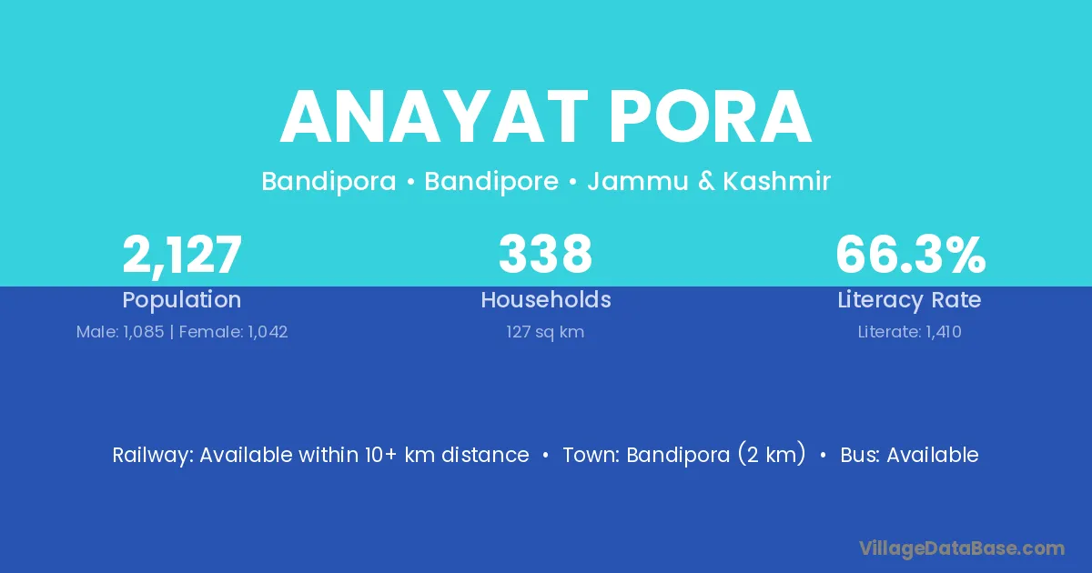 Bandipora (2 km) is the nearest town to Anayat Pora village for major economic activities and is located approximately 2 km away.