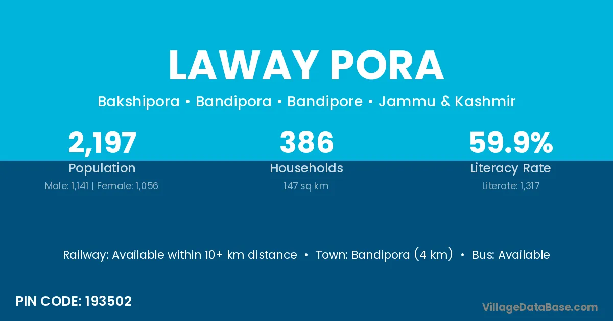 Bandipora (4 km) is the nearest town to Laway Pora village for major economic activities and is located approximately 4 km away.
