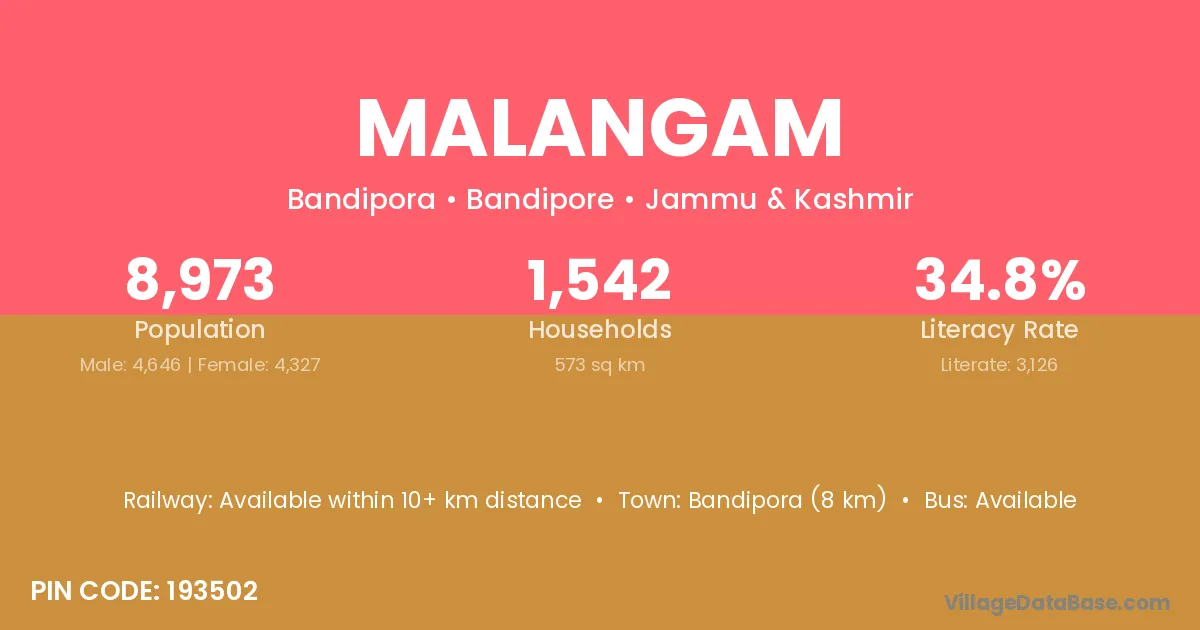 Bandipora (8 km) is the nearest town to Malangam village for major economic activities and is located approximately 8 km away.
