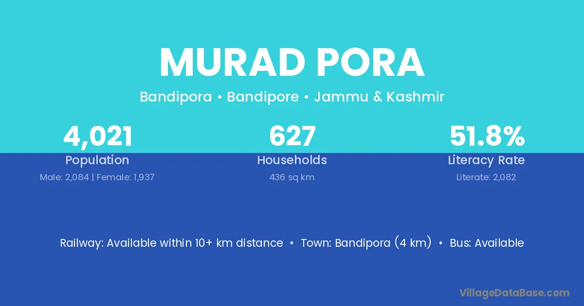 Bandipora (4 km) is the nearest town to Murad Pora village for major economic activities and is located approximately 4 km away.