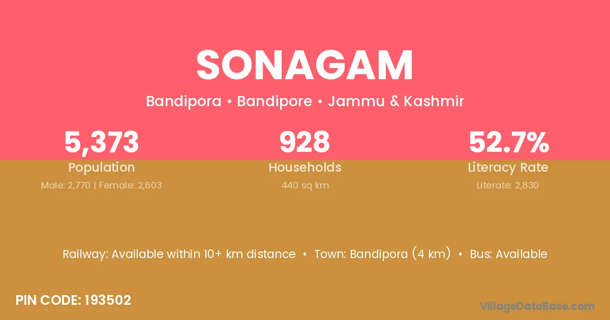Bandipora (4 km) is the nearest town to Sonagam village for major economic activities and is located approximately 4 km away.