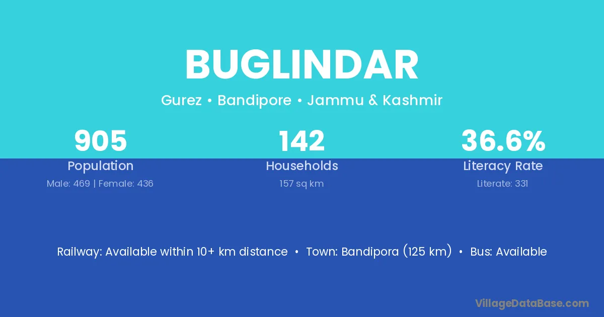 Bandipora (125 km) is the nearest town to Buglindar village for major economic activities and is located approximately 125 km away.
