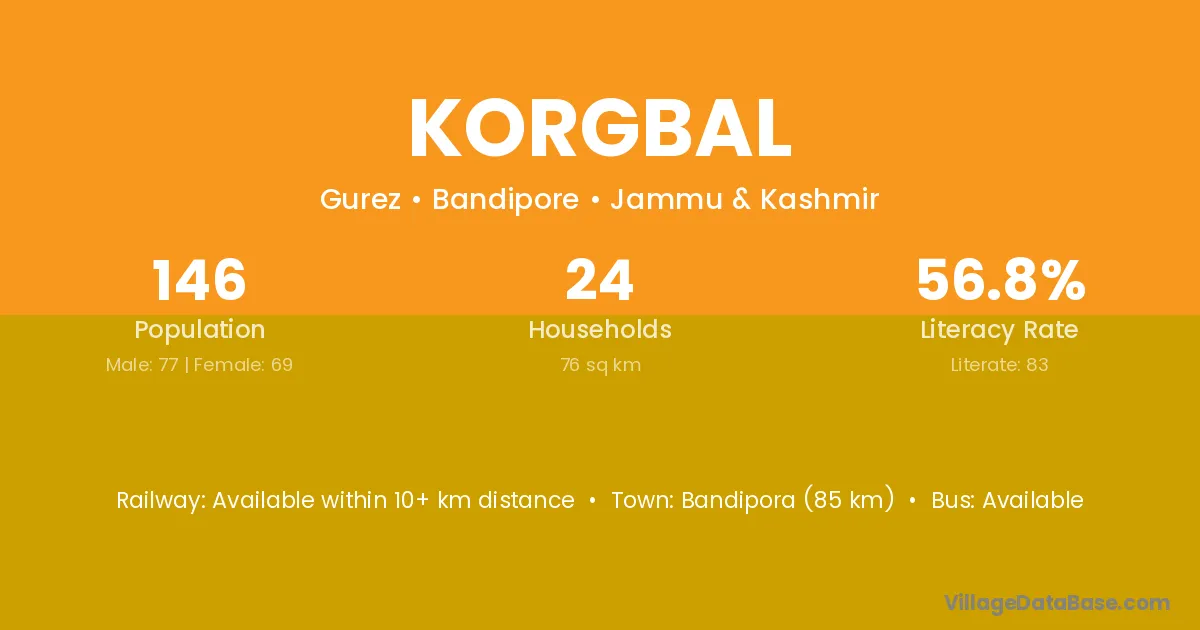 Bandipora (85 km) is the nearest town to Korgbal village for major economic activities and is located approximately 85 km away.