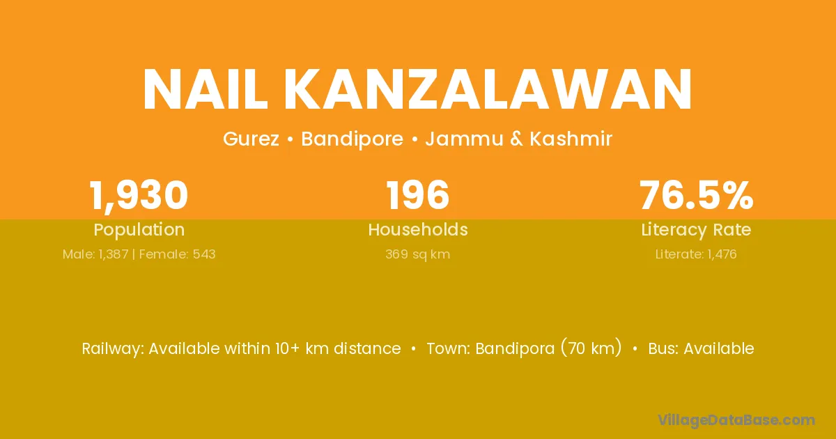 Bandipora (70 km) is the nearest town to Nail Kanzalawan village for major economic activities and is located approximately 70 km away.