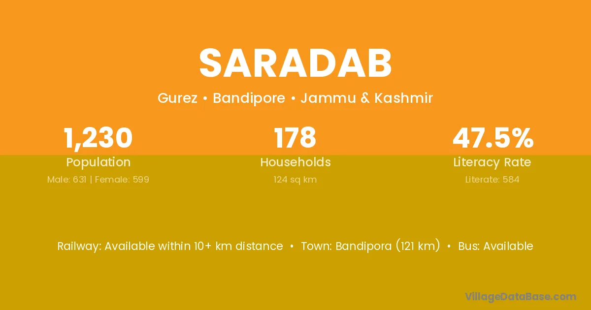 Bandipora (121 km) is the nearest town to Saradab village for major economic activities and is located approximately 121 km away.