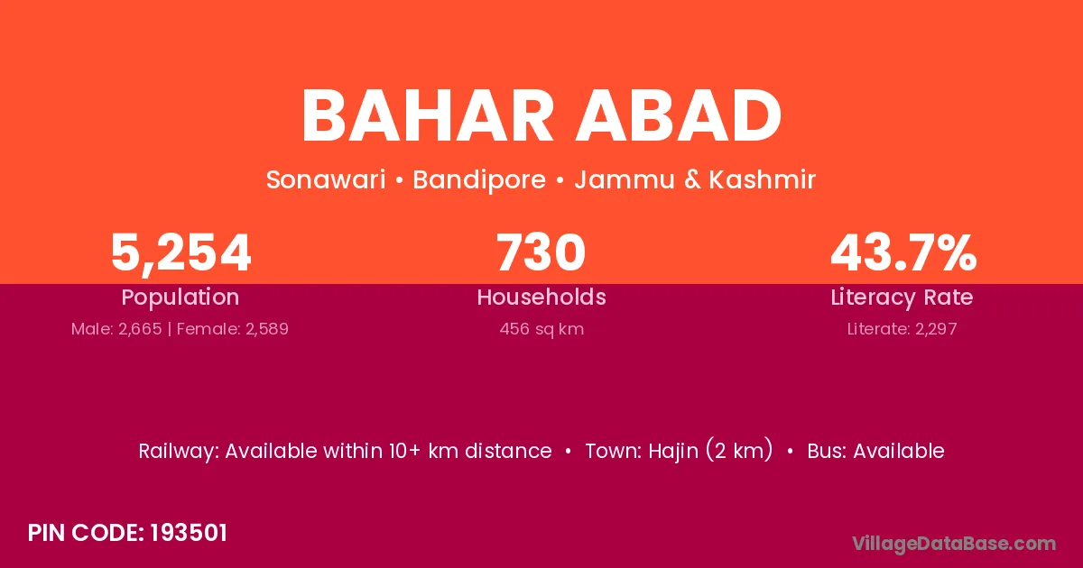 Bahar Abad village has a total population of 5,254 people, of which 2,665 are males and 2,589 are females.