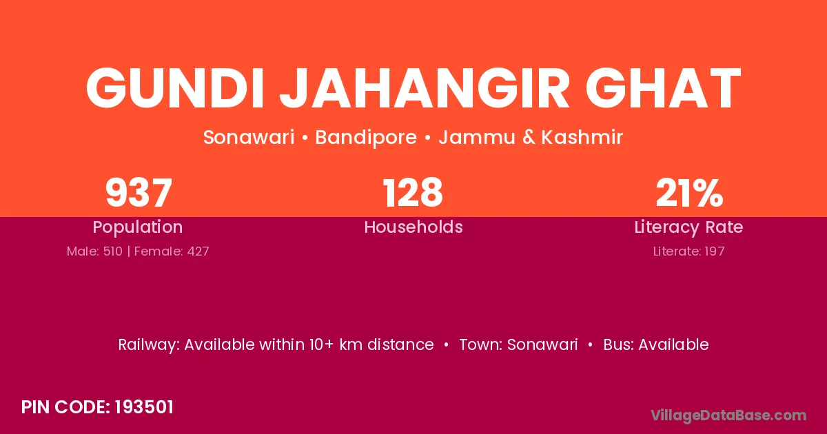 Gundi Jahangir Ghat village has a total population of 937 people, of which 510 are males and 427 are females.