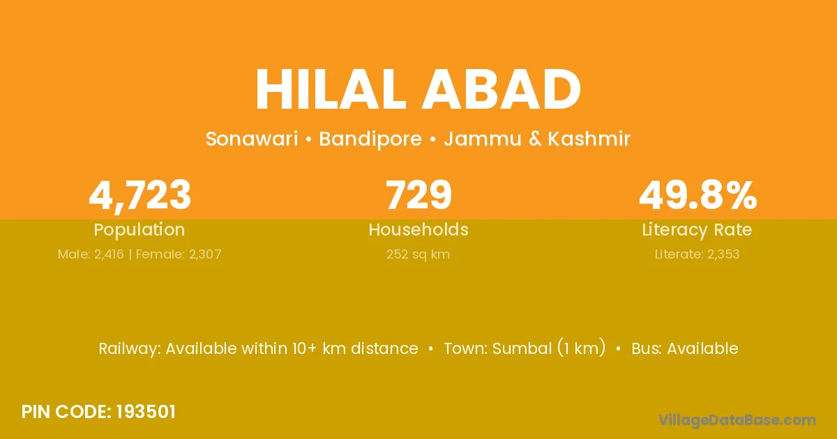 Sumbal (1 km) is the nearest town to Hilal Abad village for major economic activities and is located approximately 1 km away.