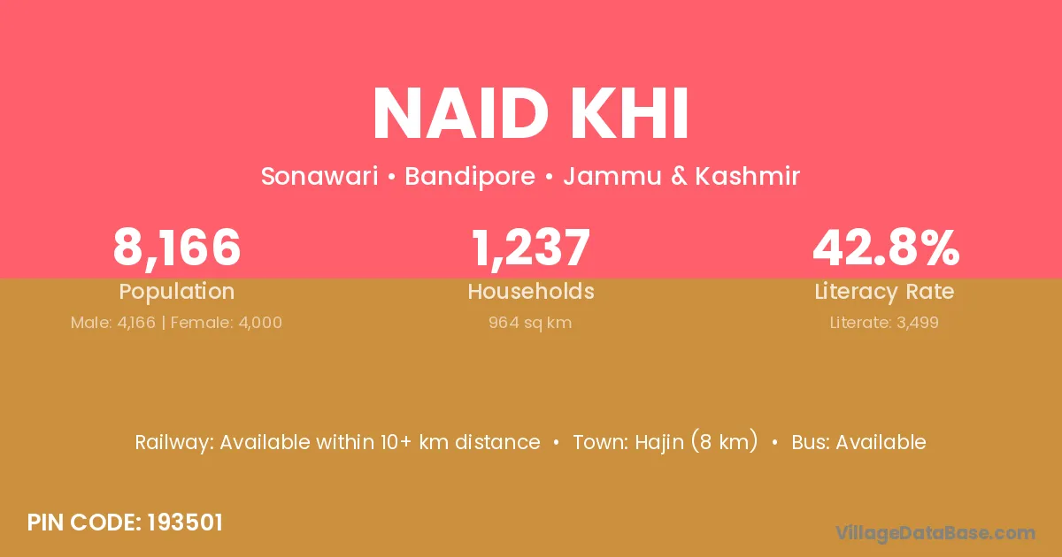Hajin (8 km) is the nearest town to Naid Khi village for major economic activities and is located approximately 8 km away.