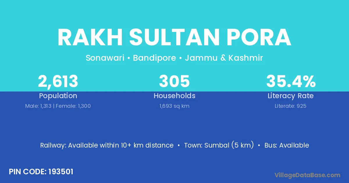 Rakh Sultan Pora village has a total population of 2,613 people, of which 1,313 are males and 1,300 are females.