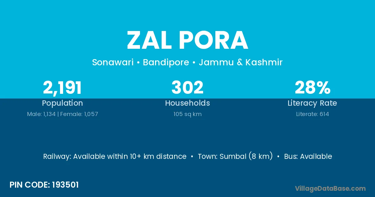 Sumbal (8 km) is the nearest town to Zal Pora village for major economic activities and is located approximately 8 km away.