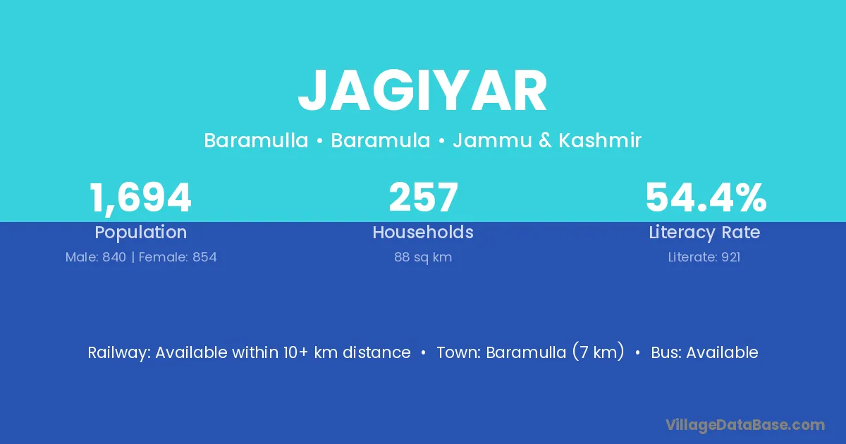 Baramulla (7 km) is the nearest town to Jagiyar village for major economic activities and is located approximately 7 km away.