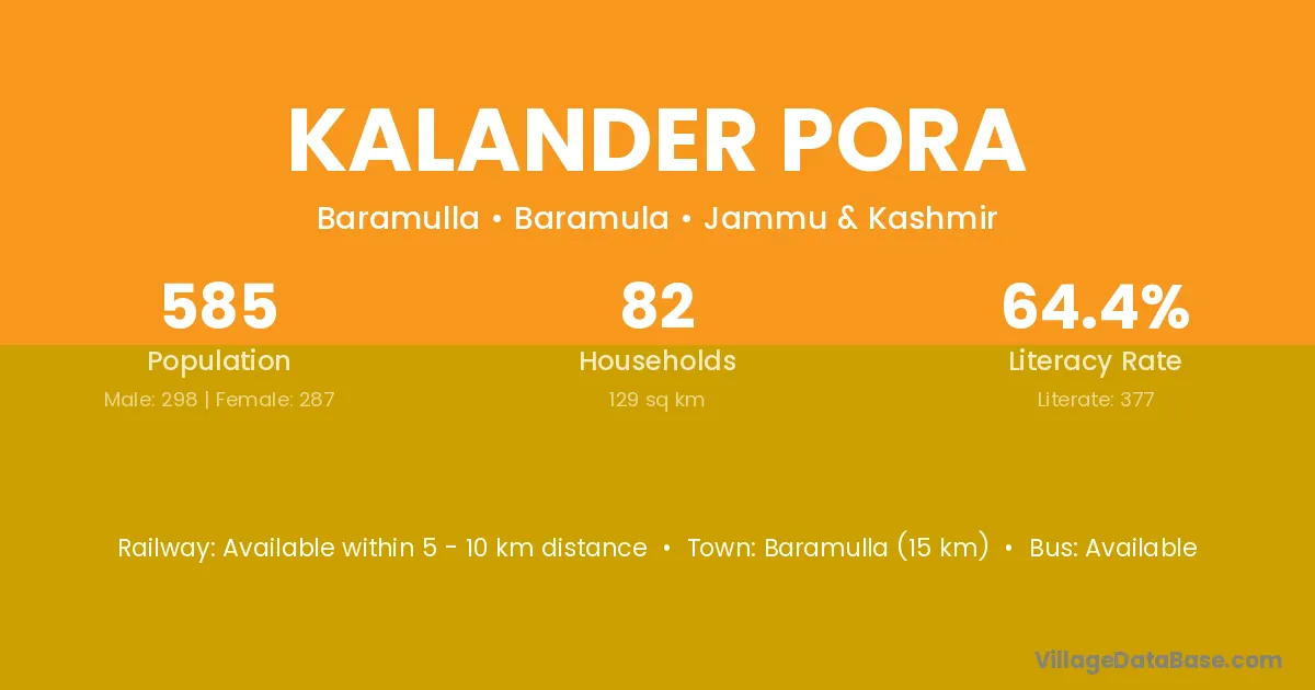 Baramulla (15 km) is the nearest town to Kalander Pora village for major economic activities and is located approximately 15 km away.