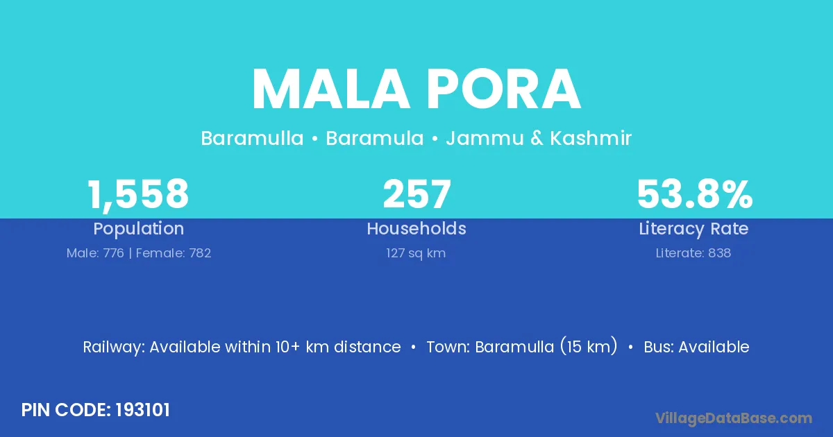 Baramulla (15 km) is the nearest town to Mala Pora village for major economic activities and is located approximately 15 km away.