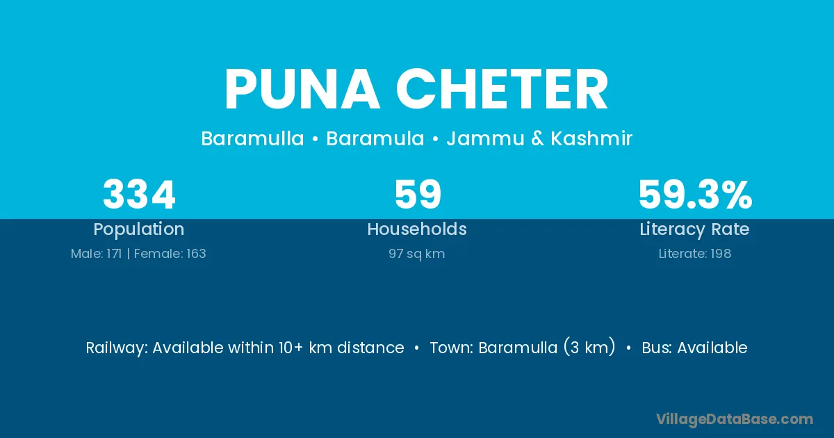 Baramulla (3 km) is the nearest town to Puna Cheter village for major economic activities and is located approximately 3 km away.