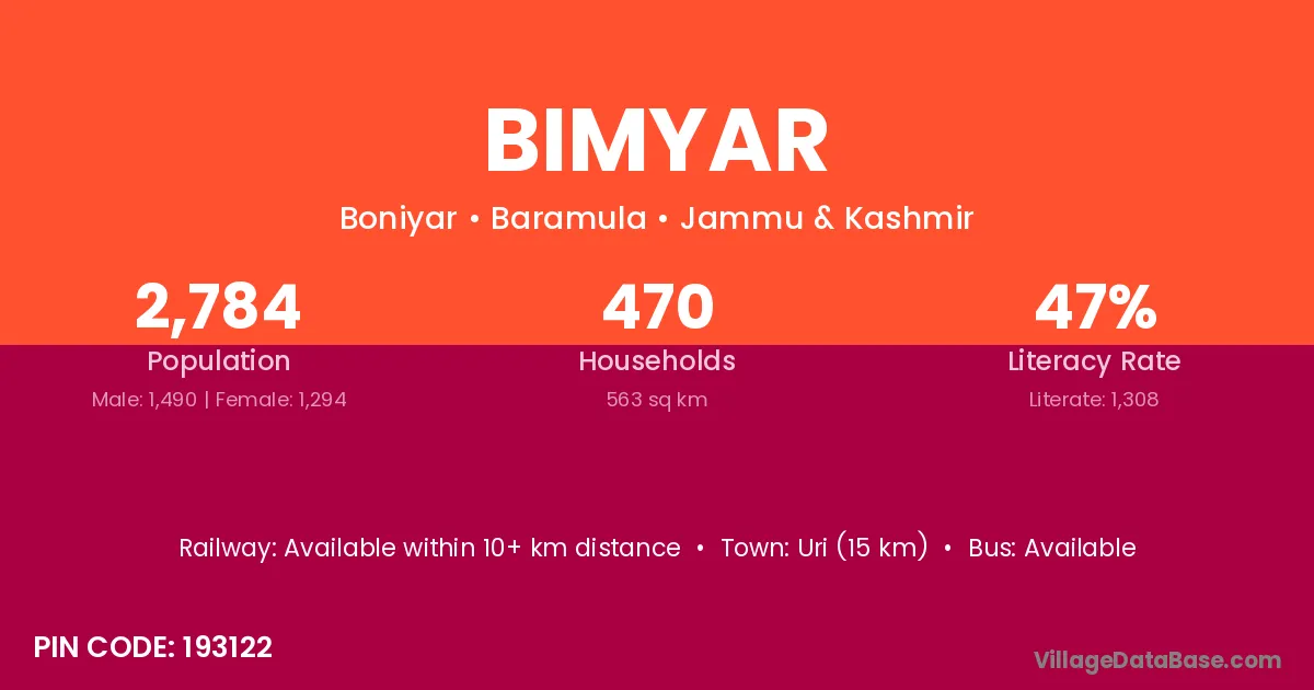 Uri (15 km) is the nearest town to Bimyar village for major economic activities and is located approximately 15 km away.