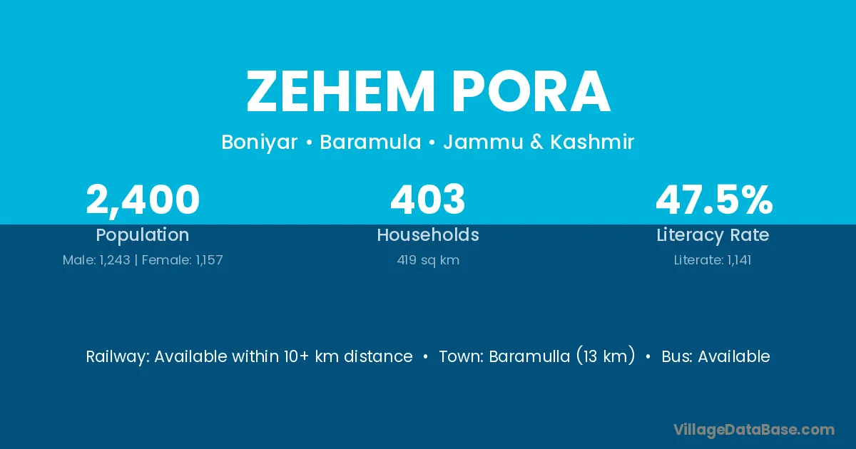 Baramulla (13 km) is the nearest town to Zehem Pora village for major economic activities and is located approximately 13 km away.
