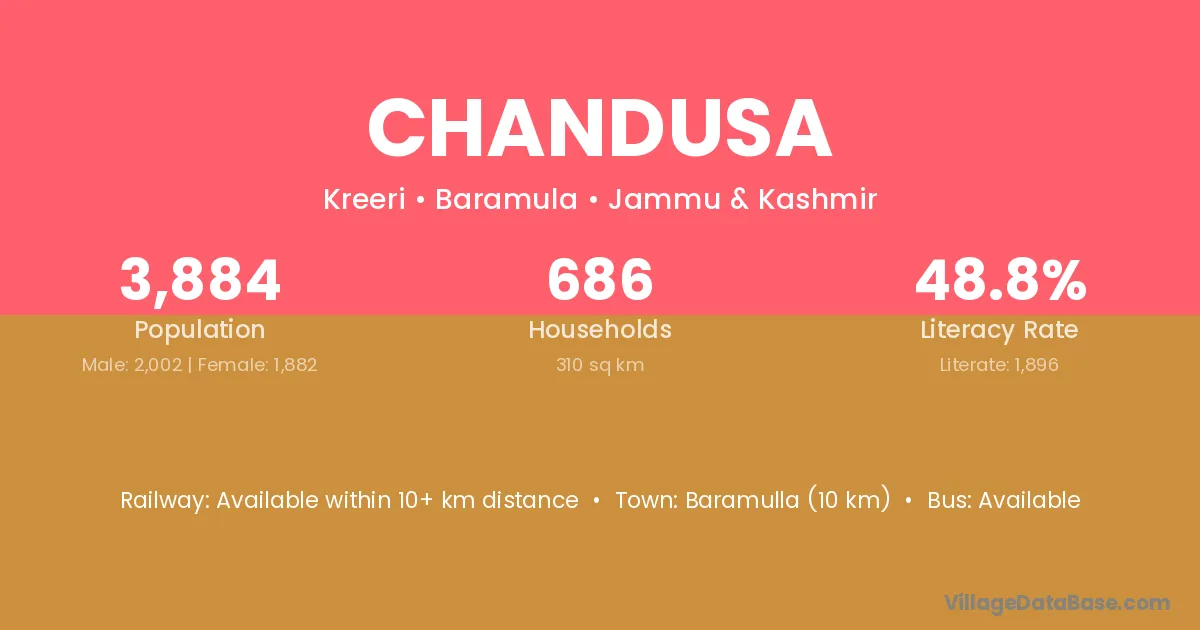 Baramulla (10 km) is the nearest town to Chandusa village for major economic activities and is located approximately 10 km away.