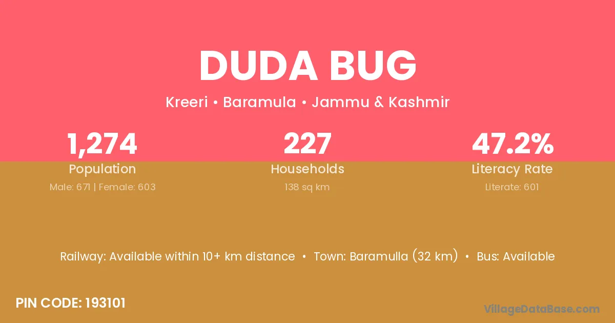Baramulla (32 km) is the nearest town to Duda Bug village for major economic activities and is located approximately 32 km away.