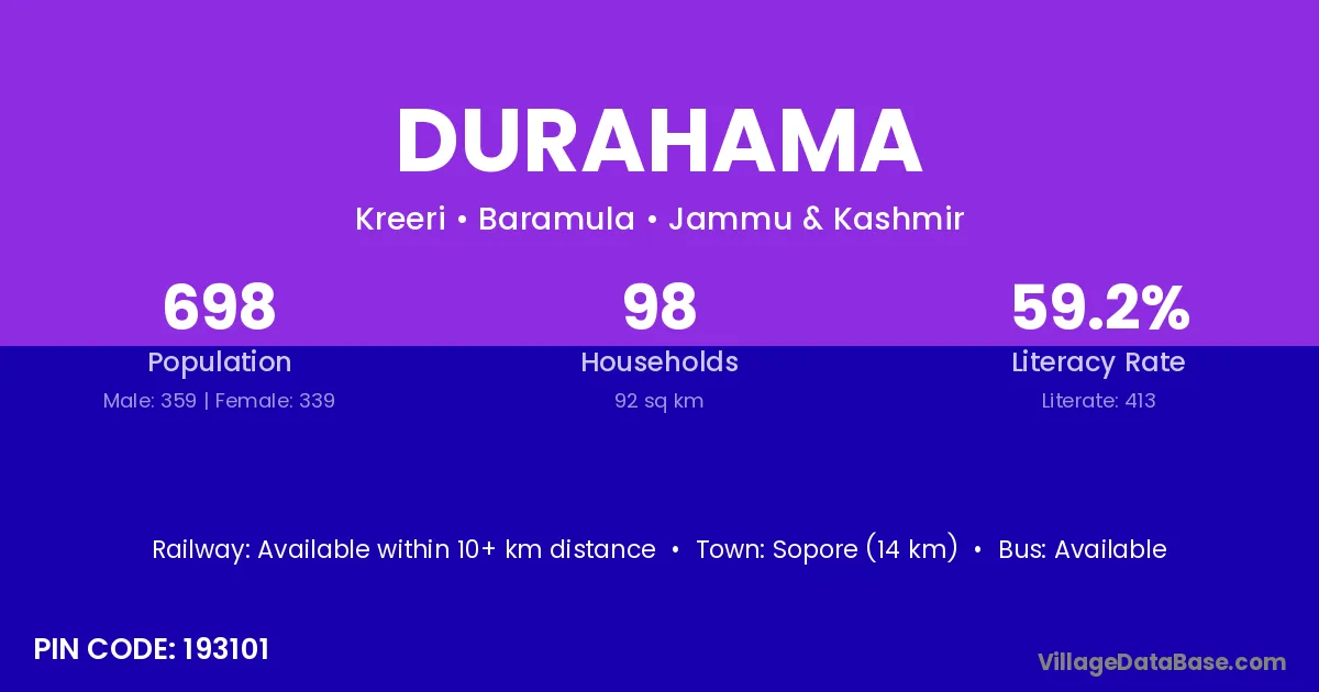 Sopore (14 km) is the nearest town to Durahama village for major economic activities and is located approximately 14 km away.