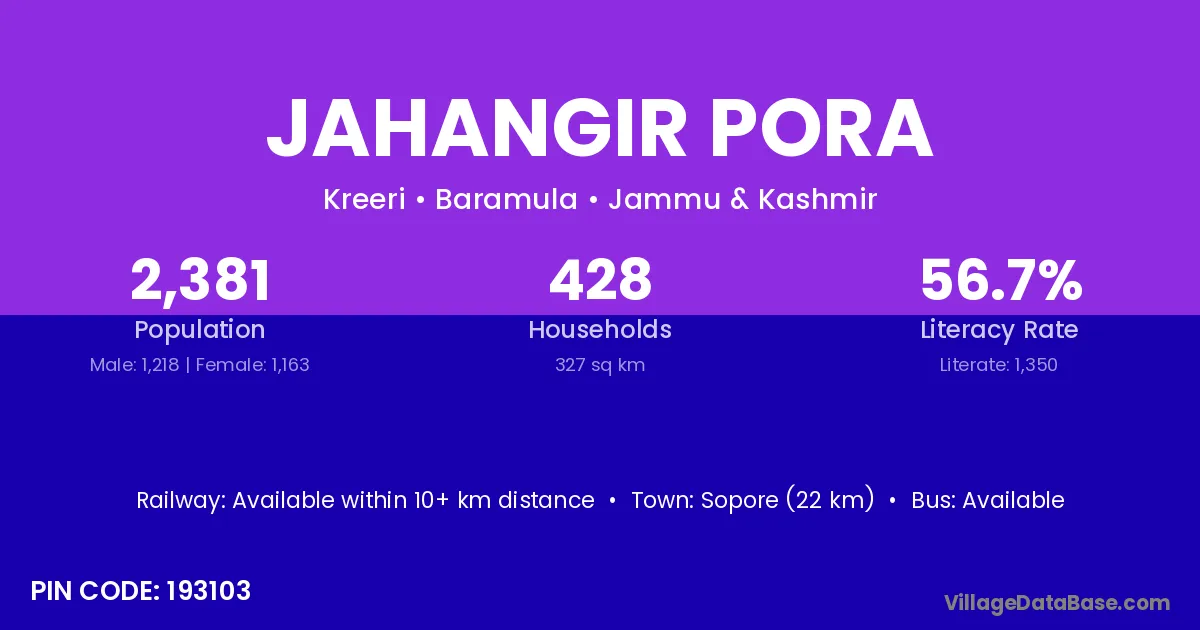 Jahangir Pora village has a total population of 2,381 people, of which 1,218 are males and 1,163 are females.