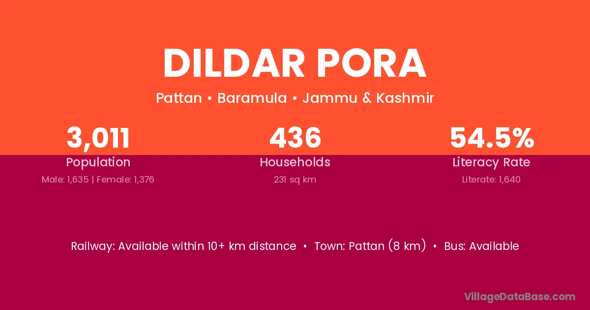 Dildar Pora village has a total population of 3,011 people, of which 1,635 are males and 1,376 are females.