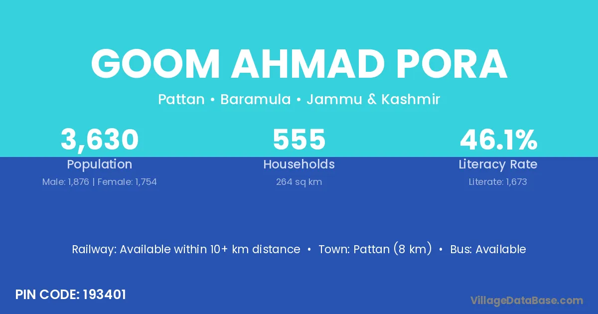 Goom Ahmad Pora village has a total population of 3,630 people, of which 1,876 are males and 1,754 are females.