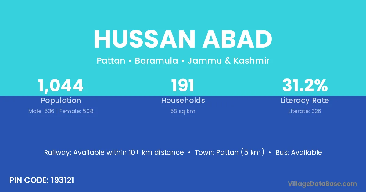 Pattan (5 km) is the nearest town to Hussan Abad village for major economic activities and is located approximately 5 km away.