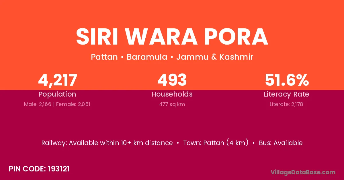 Siri Wara Pora village has a total population of 4,217 people, of which 2,166 are males and 2,051 are females.