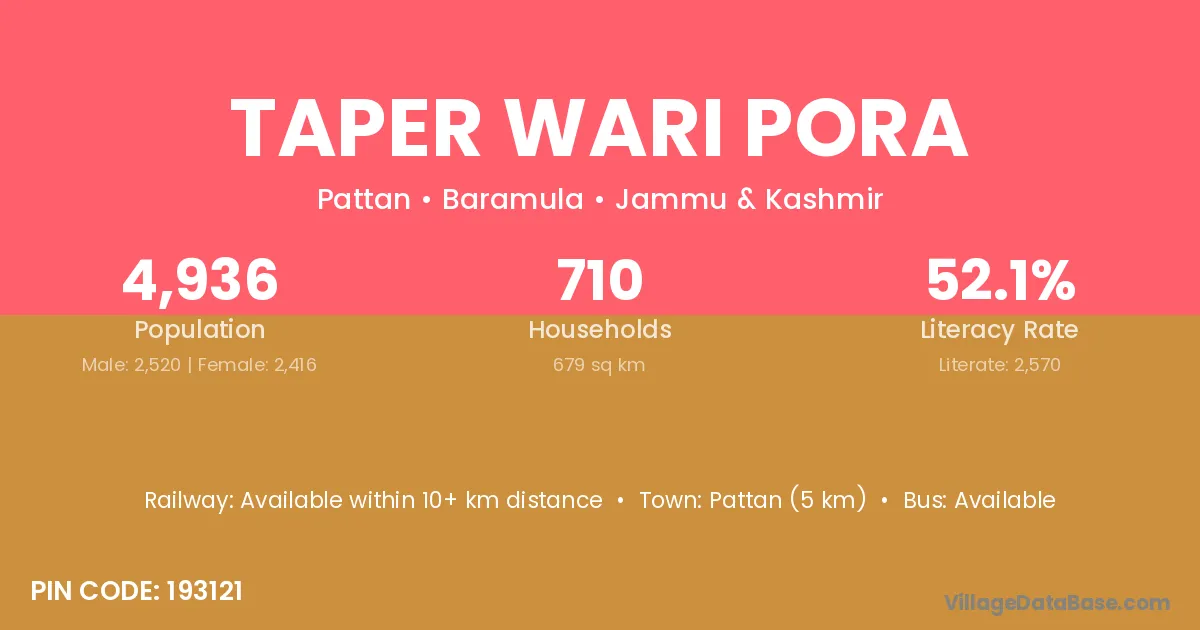 Pattan (5 km) is the nearest town to Taper Wari Pora village for major economic activities and is located approximately 5 km away.