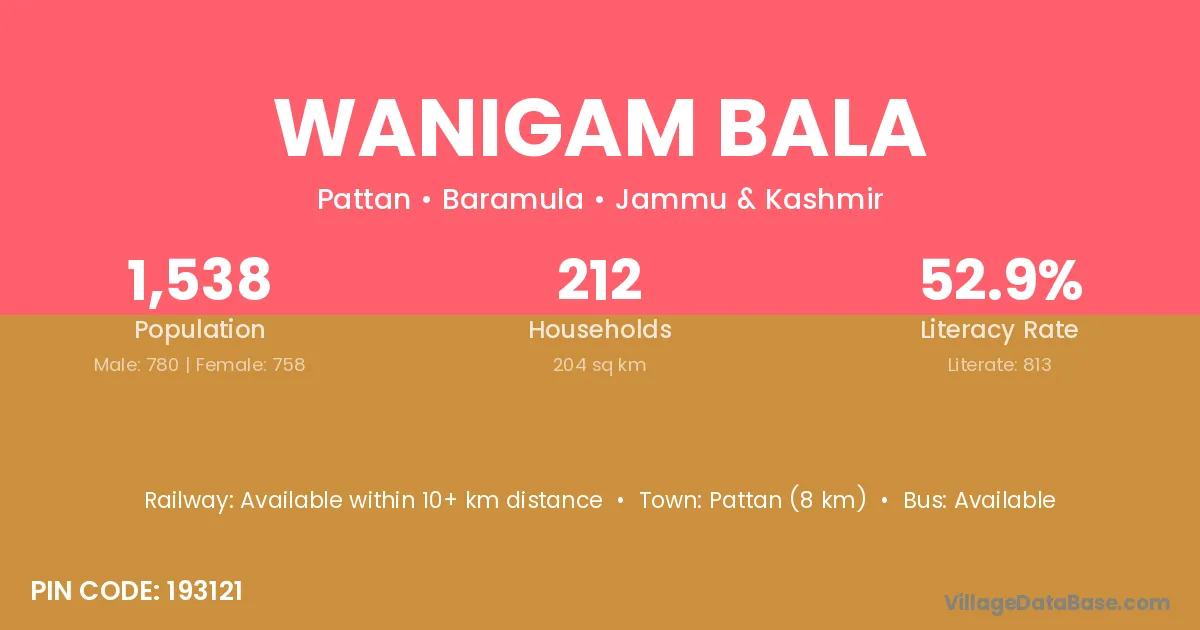 Pattan (8 km) is the nearest town to Wanigam Bala village for major economic activities and is located approximately 8 km away.