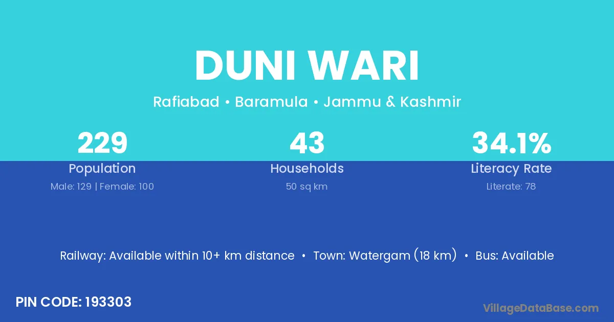 Watergam (18 km) is the nearest town to Duni Wari village for major economic activities and is located approximately 18 km away.