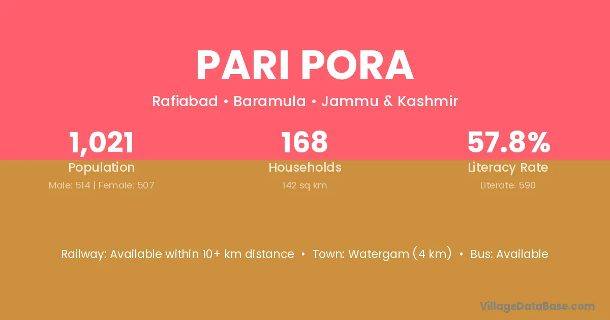 Pari Pora village has a total population of 1,021 people, of which 514 are males and 507 are females.