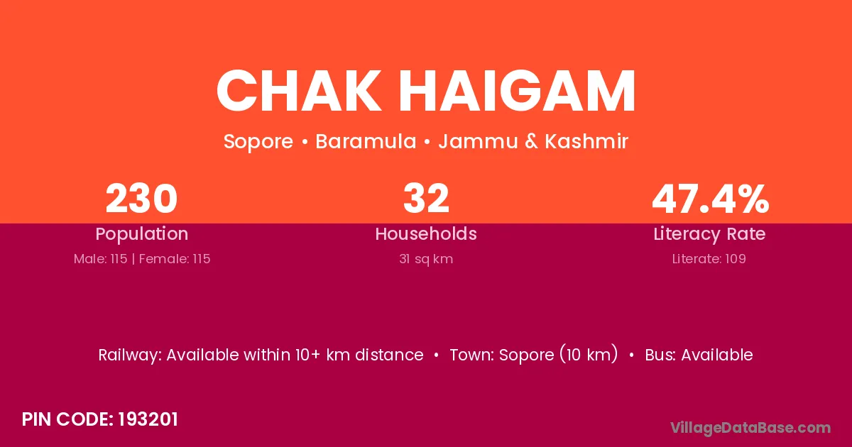 Chak Haigam village has a total population of 230 people, of which 115 are males and 115 are females.