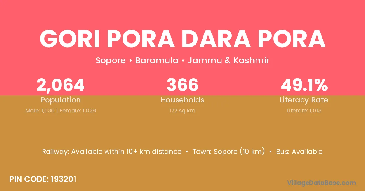 Gori Pora Dara Pora village has a total population of 2,064 people, of which 1,036 are males and 1,028 are females.