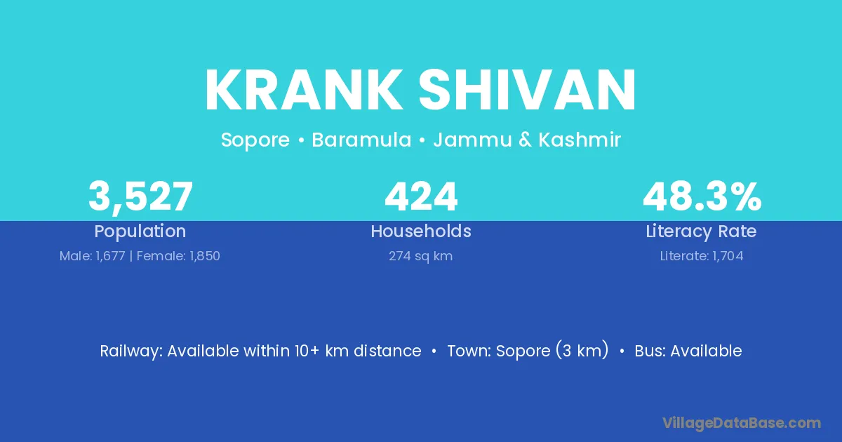 Sopore (3 km) is the nearest town to Krank Shivan village for major economic activities and is located approximately 3 km away.
