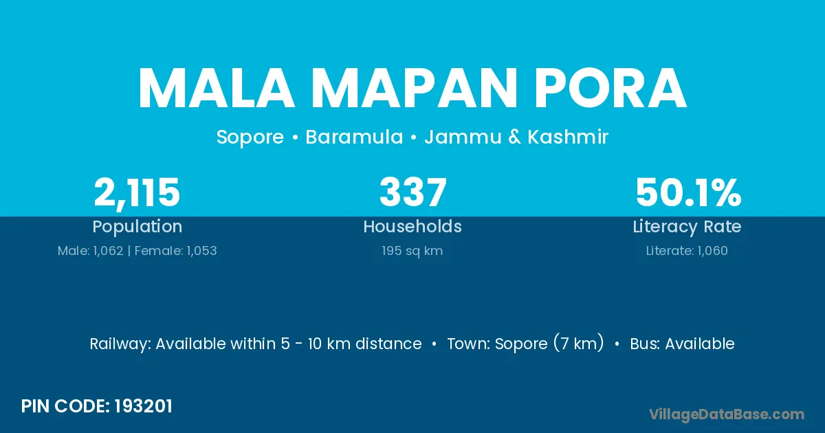 Sopore (7 km) is the nearest town to Mala Mapan Pora village for major economic activities and is located approximately 7 km away.