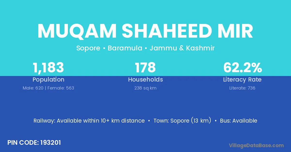Sopore (13 km) is the nearest town to Muqam Shaheed Mir village for major economic activities and is located approximately 13 km away.