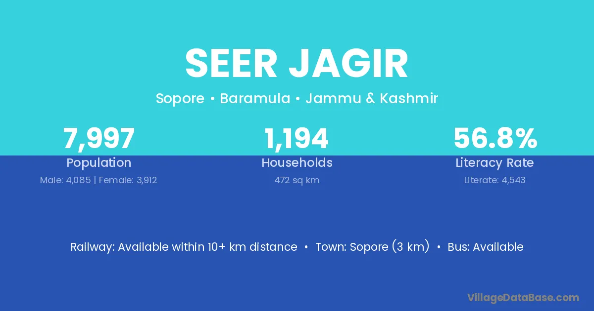 Sopore (3 km) is the nearest town to Seer Jagir village for major economic activities and is located approximately 3 km away.