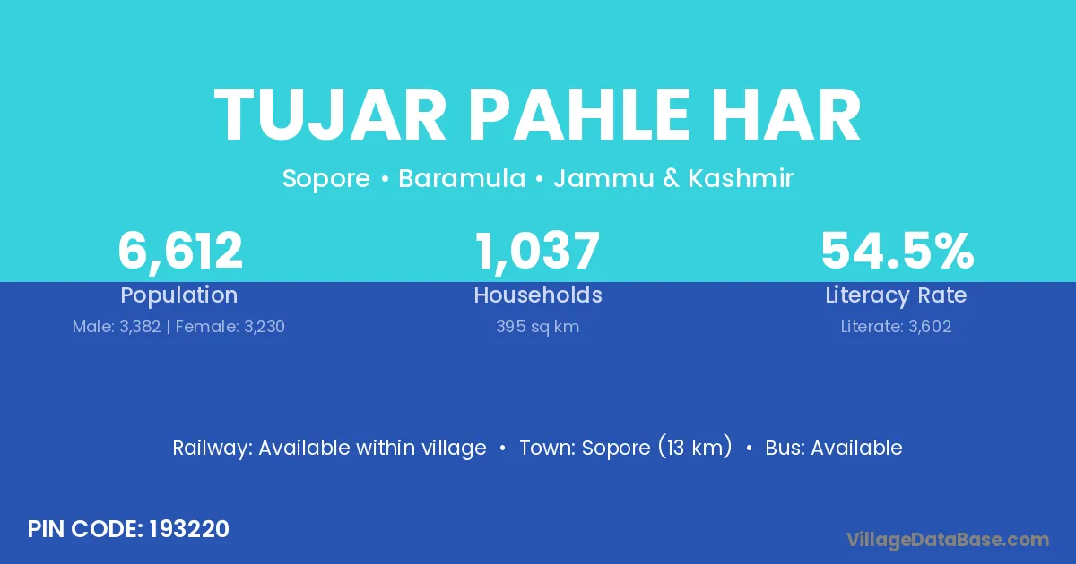 Sopore (13 km) is the nearest town to Tujar Pahle Har village for major economic activities and is located approximately 13 km away.