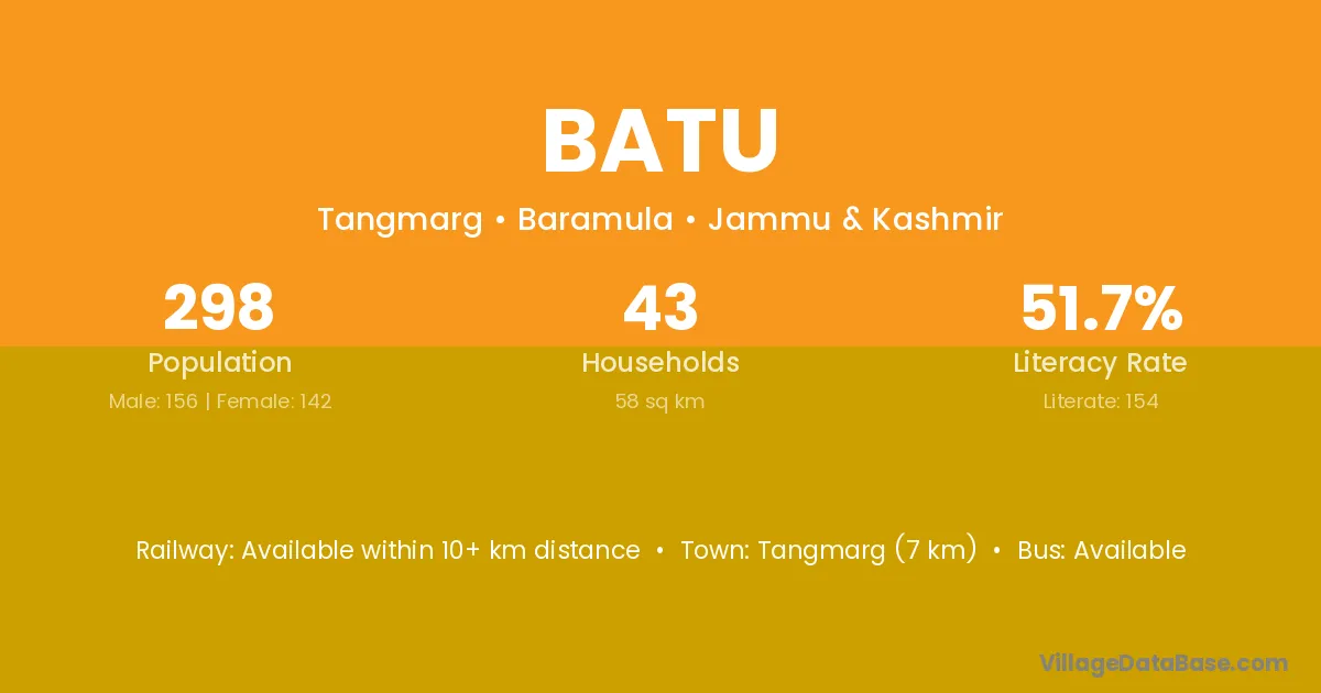 Tangmarg (7 km) is the nearest town to Batu village for major economic activities and is located approximately 7 km away.