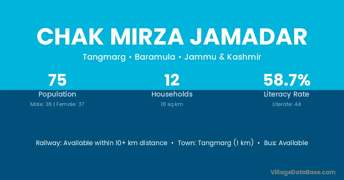 Tangmarg (1 km) is the nearest town to Chak Mirza Jamadar village for major economic activities and is located approximately 1 km away.