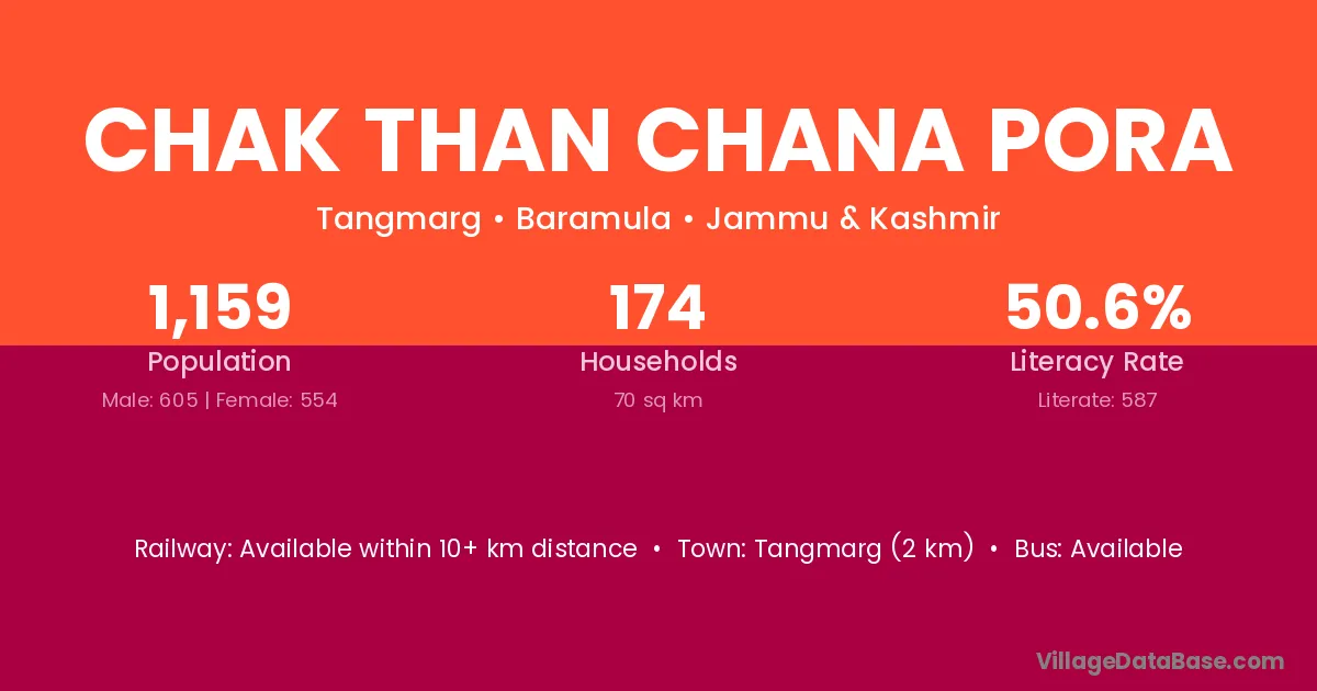 Tangmarg (2 km) is the nearest town to Chak Than Chana Pora village for major economic activities and is located approximately 2 km away.