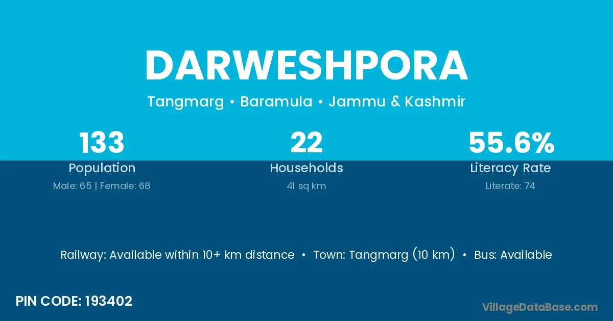 Tangmarg (10 km) is the nearest town to Darweshpora village for major economic activities and is located approximately 10 km away.