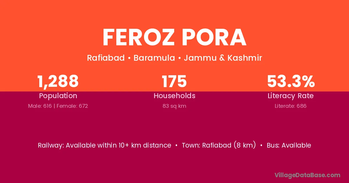 Tangmarg (1 km) is the nearest town to Feroz Pora village for major economic activities and is located approximately 1 km away.