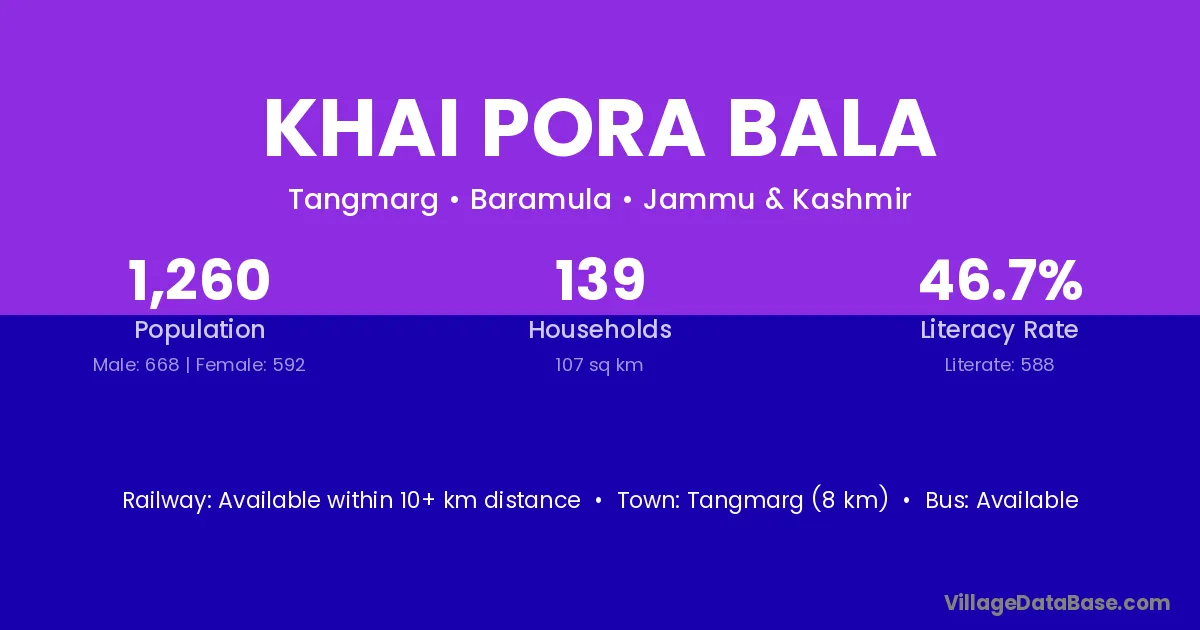 Khai Pora Bala village has a total population of 1,260 people, of which 668 are males and 592 are females.