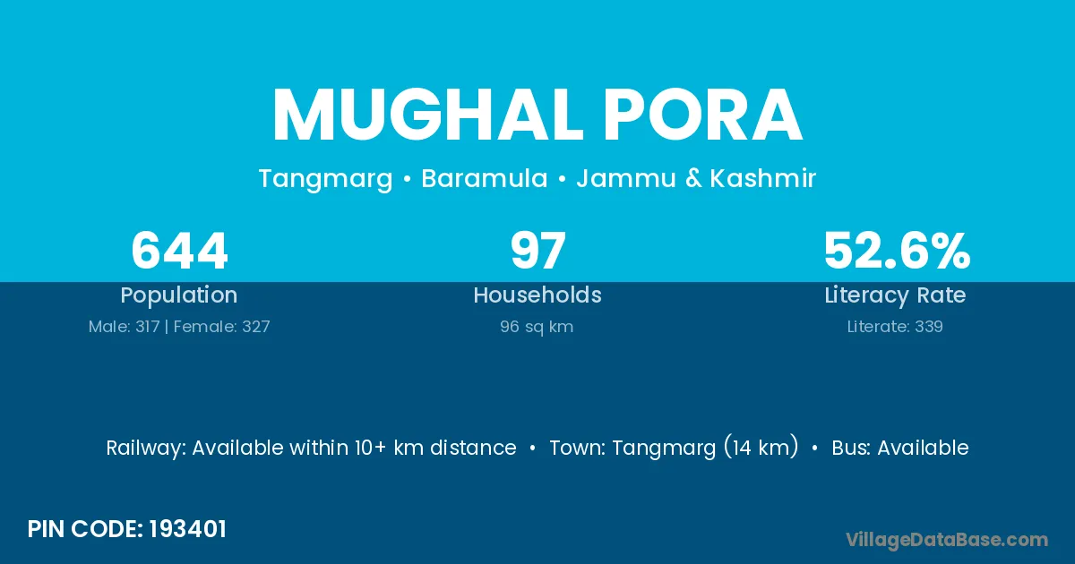 Tangmarg (14 km) is the nearest town to Mughal Pora village for major economic activities and is located approximately 14 km away.