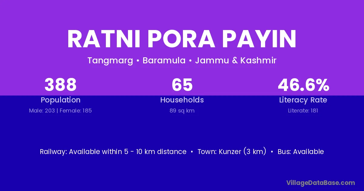 Kunzer (3 km) is the nearest town to Ratni Pora Payin village for major economic activities and is located approximately 3 km away.