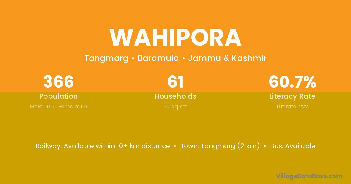 Tangmarg (2 km) is the nearest town to Wahipora village for major economic activities and is located approximately 2 km away.